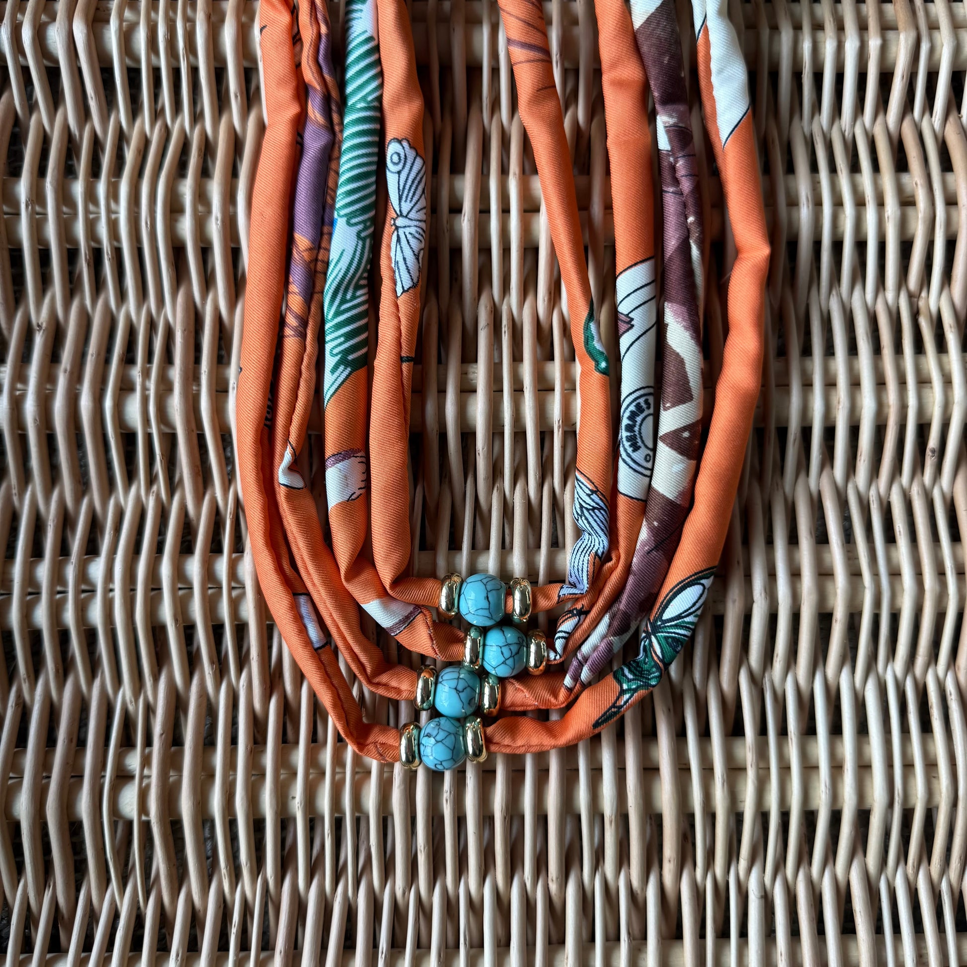 The No. 3 Silk Hat Tie is predominantly orange, with elements of white, blue, tan, and saddle brown and finished with a composite turquoise bead and a gold mariner’s link bead to secure the ends.