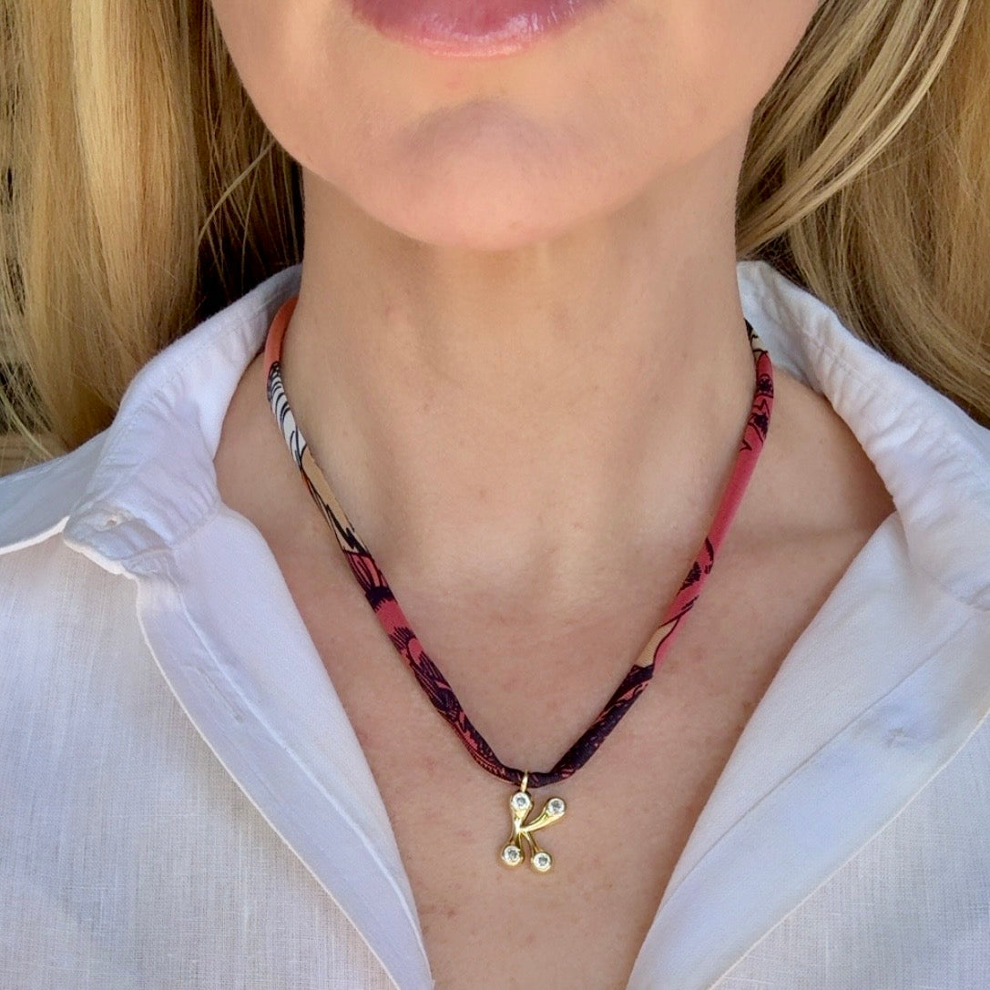 The No. 33 Silk Tie is hues of a dusty desert sunset with shades of rose, blush coral, and burnt orange with deep noir accents. Shown with the 'K' charm in the first photo. No. 3 shown with the 'AN' charms.